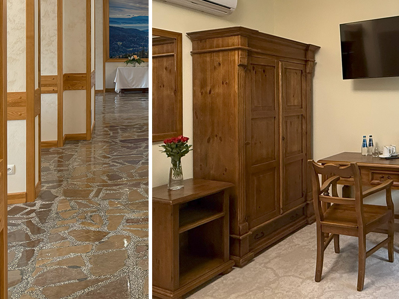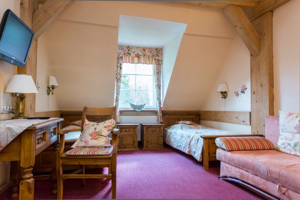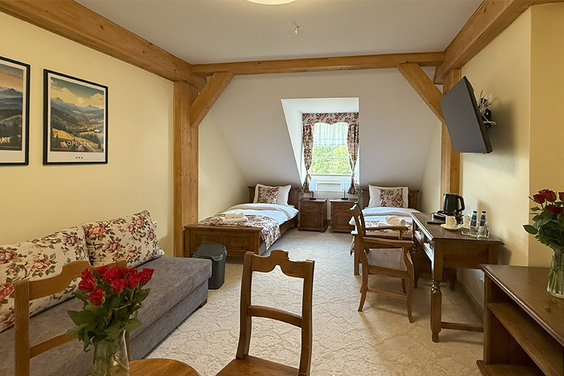 W pokojach Delux odnajdziecie odnowione meble z litego drewna, które zachowaliśmy w oryginalnej formie, podkreślając ich historię i duszę. Dopełniają je naturalne tkaniny, kwiatowe dodatki i detale tworzące ciepły, domowy klimat. Pokoje Standard utrzymane są w podobnym stylu, lecz wypełnione  współczesnymi, funkcjonalnymi meblami. W ten sposób udało nam się połączyć komfort nowoczesności z urokiem rustykalnej aranżacji.