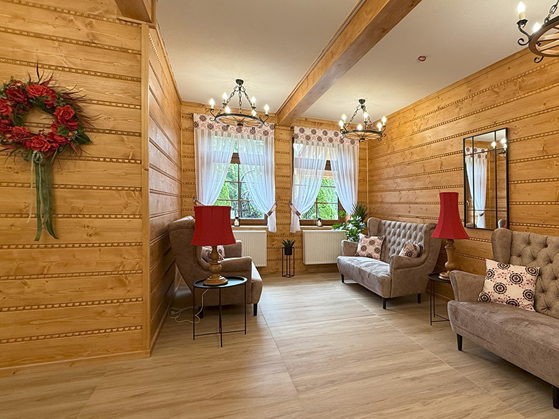 Już od progu wita Was drewniana recepcja z wyżłobionym logo Gorczańskiej Perły oraz regionalnymi zdobieniami. Ten unikalny element, podobnie jak wiele innych w ośrodku, powstał w naszej pracowni stolarskiej AMIRA.