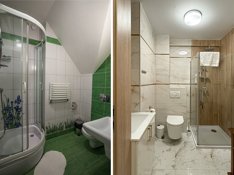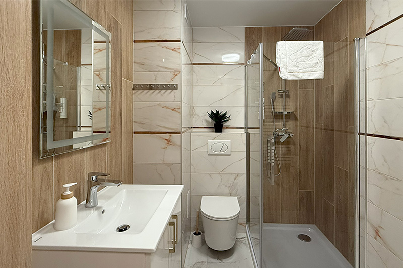 Całkowitą metamorfozę przeszły także łazienki, które zostały urządzone w nowoczesnym stylu. Zadbaliśmy przede wszystkim o ich funkcjonalność. Wszystkie łazienki posiadają prysznice z niskimi brodzikami lub prysznice bezbrodzikowe (w łazience przystosowanej dla osób z niepełnosprawnościami). Ponadto każda łazienka wyposażona jest w umywalkę z szafką, lustro z oświetleniem suszarkę do włosów oraz toaletę.