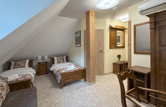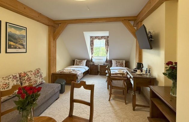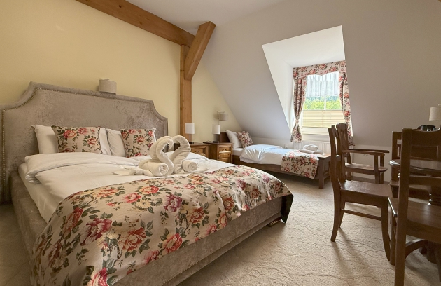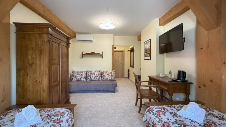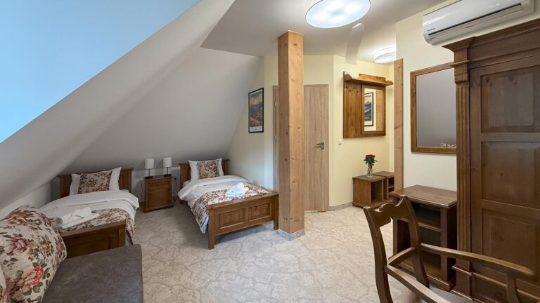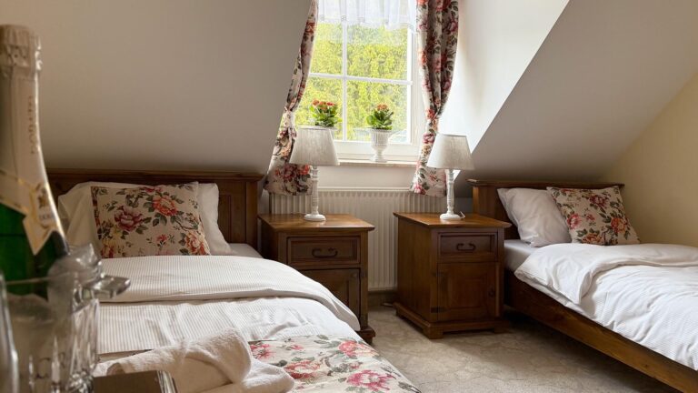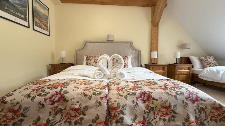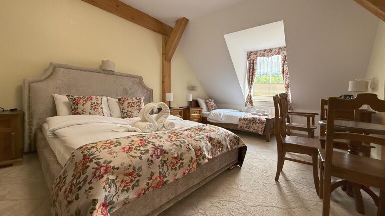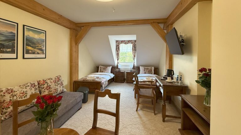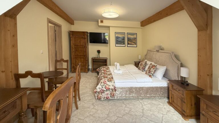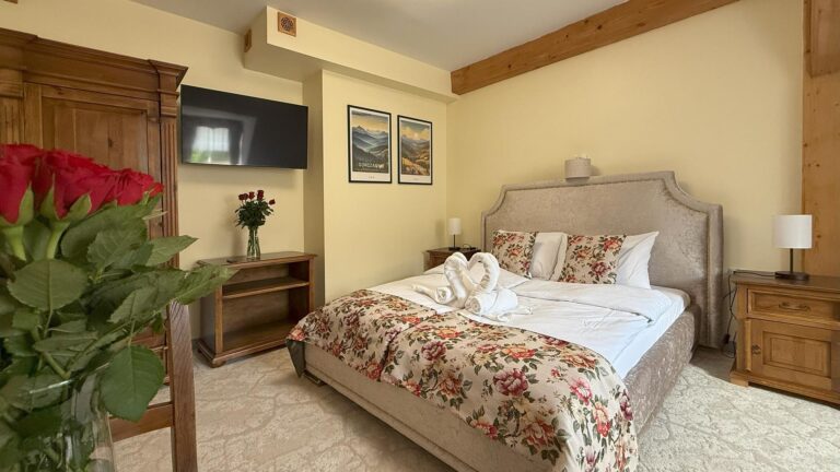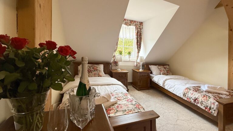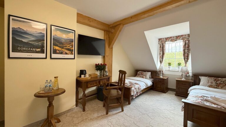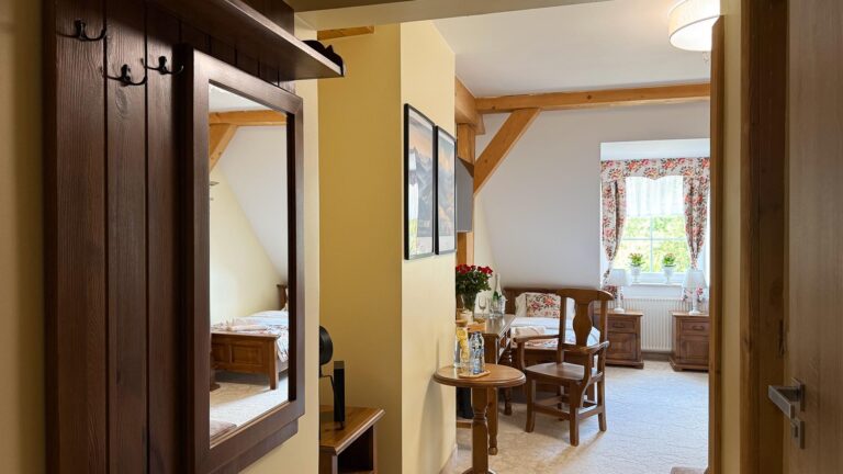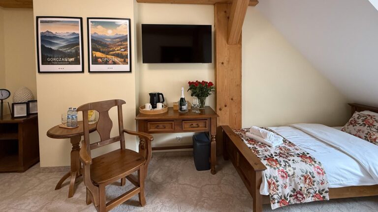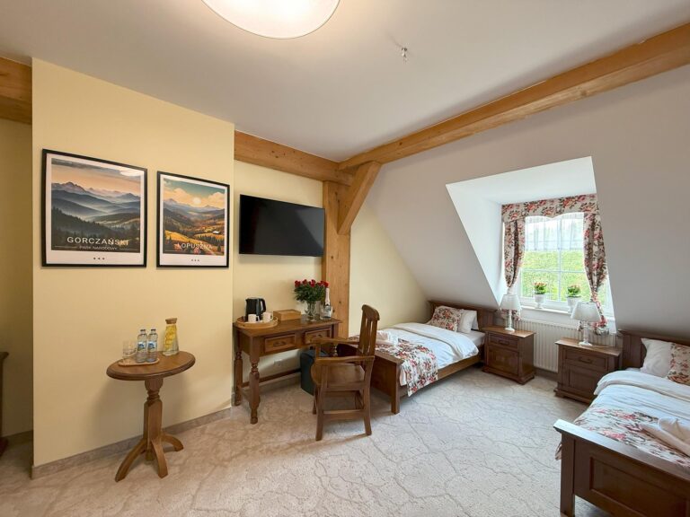 Pokoje typu Deluxe to wnętrza z duszą – pełne klimatu, przytulne i urządzone z dbałością o każdy detal. Naturalne drewno, kwiatowe dodatki i rustykalne akcenty tworzą atmosferę spokoju i domowego ciepła.