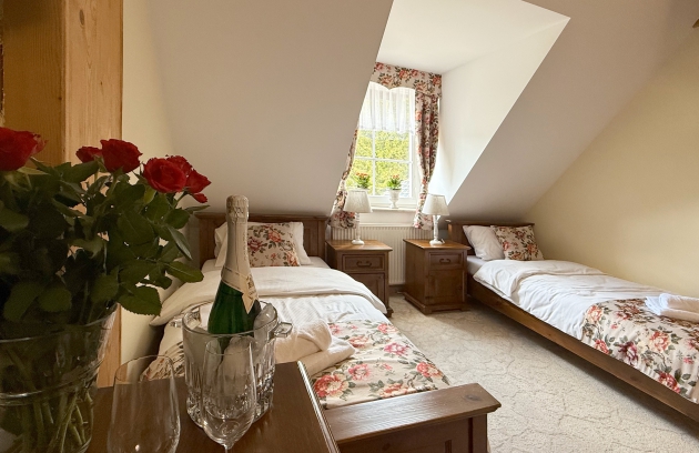 Każdy pokój kryje w sobie odnowione meble z litego drewna – unikatowe, z historią, która dodaje im charakteru. Wnętrza dopełniają naturalne tkaniny, kwiatowe motywy i drobne elementy wystroju, które przenoszą w świat prostoty i harmonii.